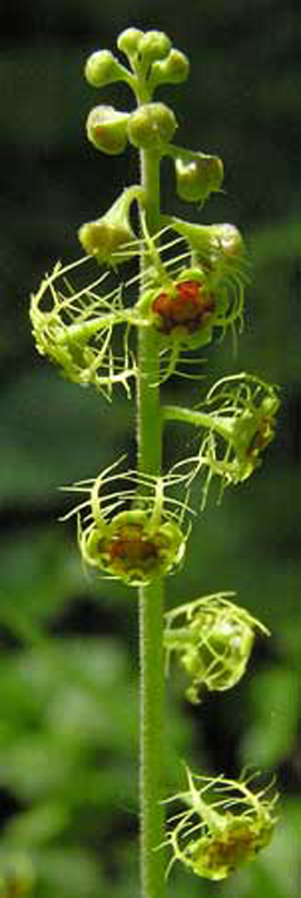 Five-star Miterwort (Mitella pentandra), Saxifrage Family (Saxifragaceae), native and common along streams, in shady forests, and in moist meadows in montane and subalpine on the eastern and western slopes. Blooms June through August. Photo by SW Colorado...