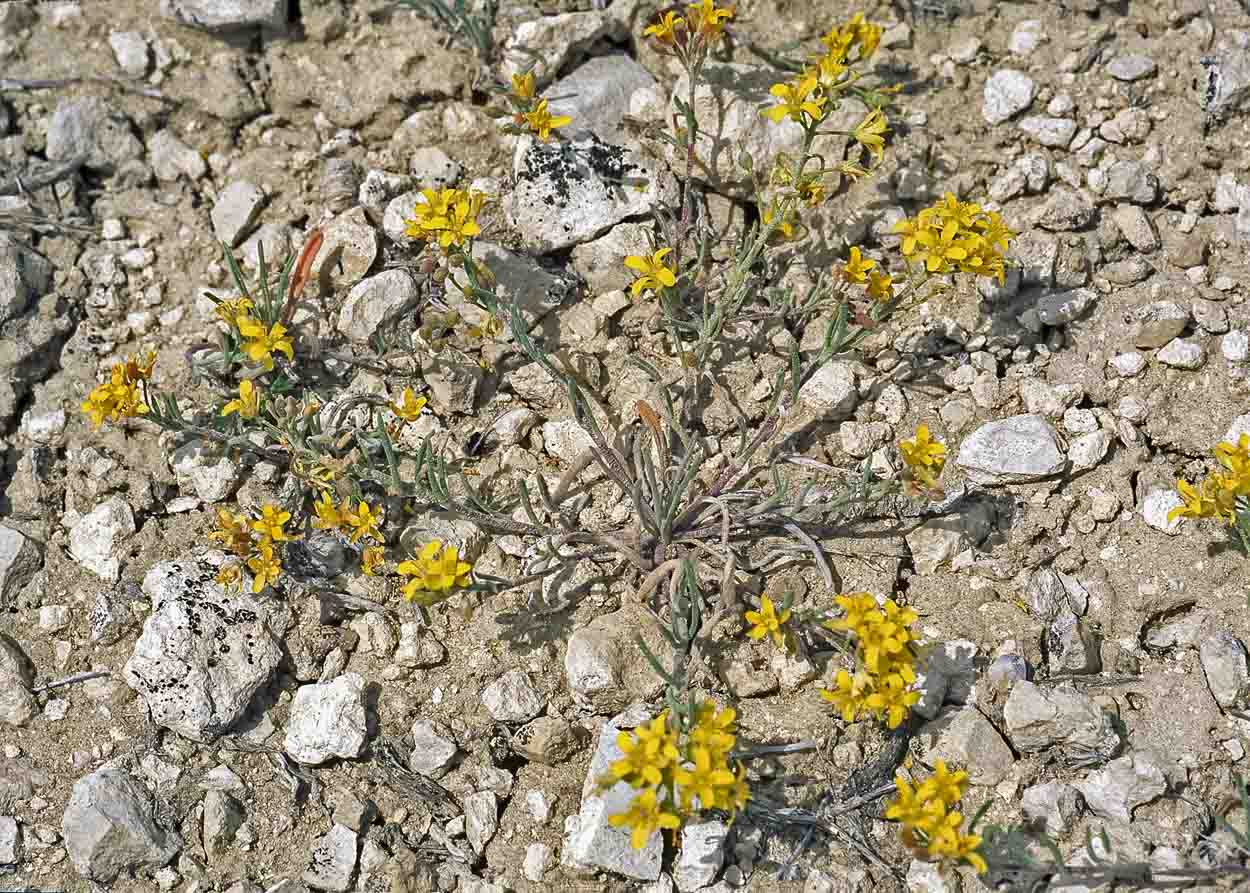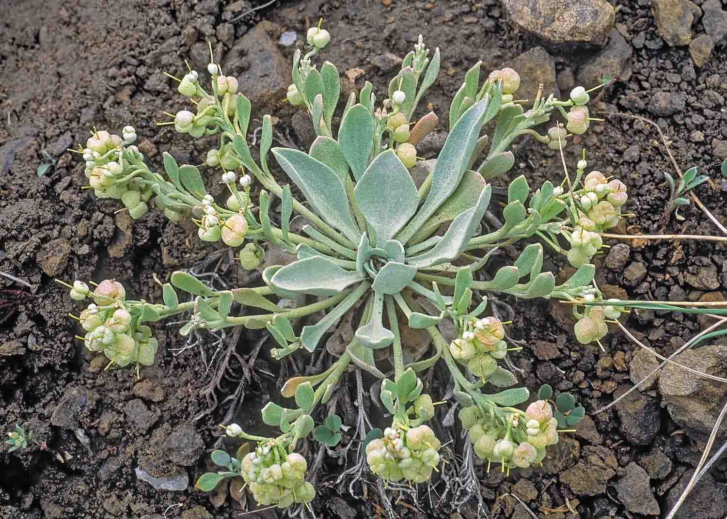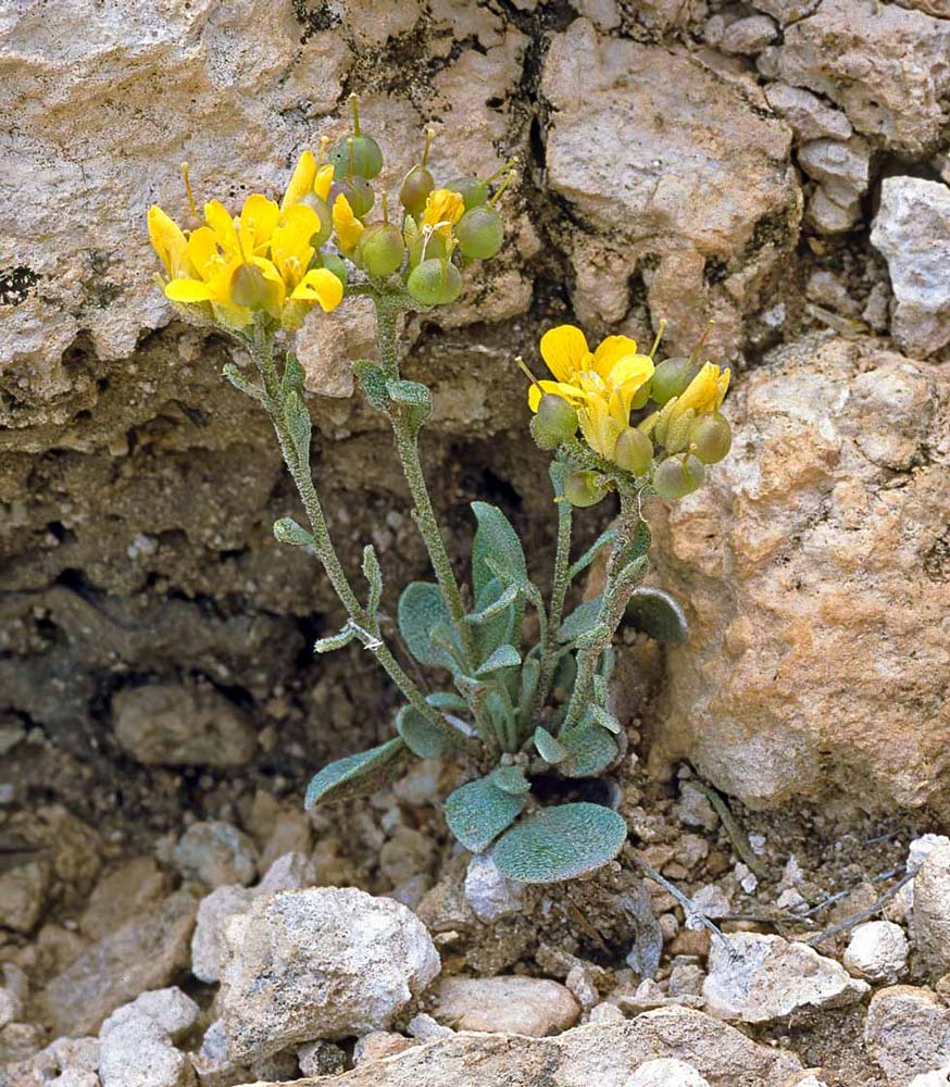 Dudley Bluffs Bladderpod (Physaria-congesta), Mustard Family (Brassicaceae). An endemic species (critically imperiled globally and in Colorado G1 S1) in the Piceance Basin in Rio Blanco County which grows on barren white shale slopes, with pinyon-juniper in the...